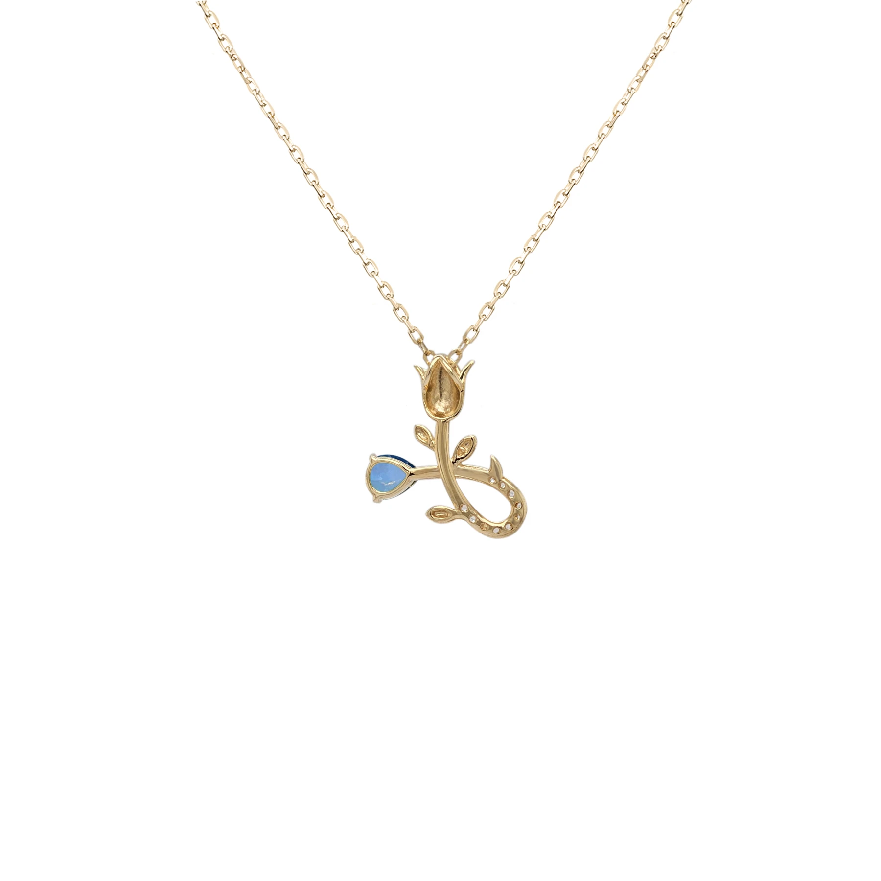 This is a gold open-necklace designed with a delicate floral motif, featuring a blue rosebud and a pear-cut blue stone, accented with small zirconia stones and leaf details for an elegant and nature-inspired aesthetic.